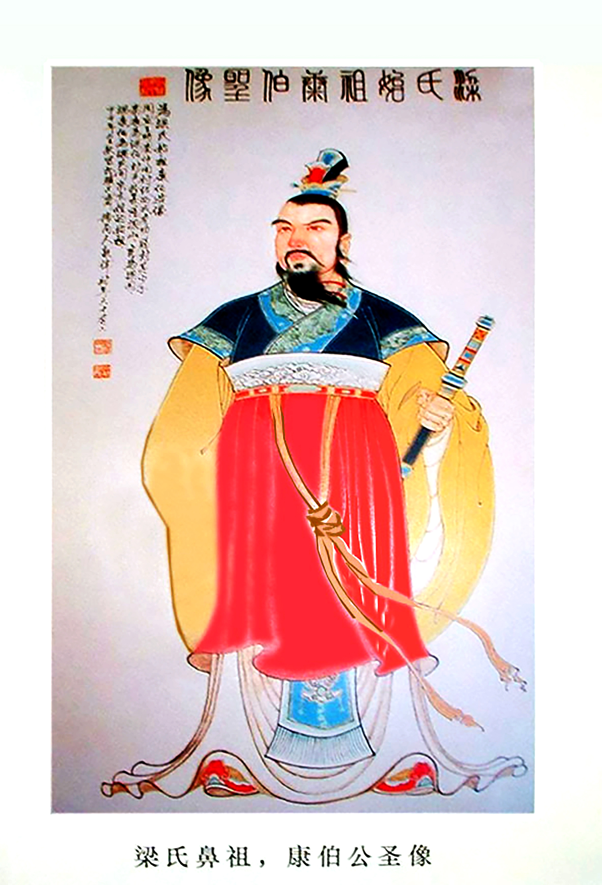 梁氏得姓始祖康伯公,名康字秦庆,号伯侃,谥康伯,系远古黄帝的嫡系后裔。康伯公生于西周时期的周宣王五年(前823年),由周宣王封地于夏阳少梁之邑(即夏阳梁山,今陕西渭南韩城南),建立梁国,尊为梁康伯,子孙皆以梁国为姓。梁康伯为中华梁氏一世祖。